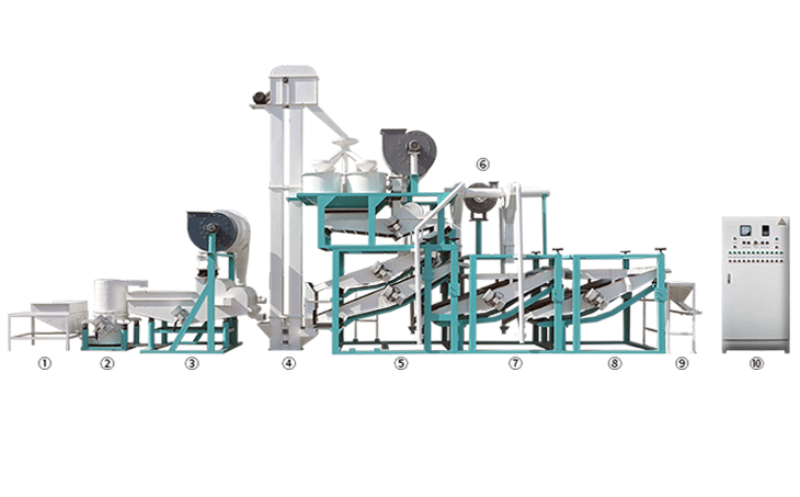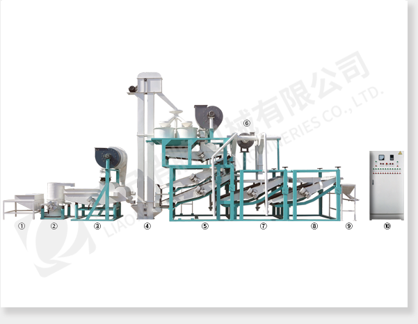 ① 上料斗② 原料提升機 ③ 多功能除雜機 ④ 斗式提升機 ⑤ 脫殼、風(fēng)選、分選主機 ⑥ 風(fēng)力回料系統(tǒng) ⑦ 籽仁復(fù)選機1 ⑧ 籽仁復(fù)選機2 ⑨ 接料斗 ⑩ 電氣控制柜