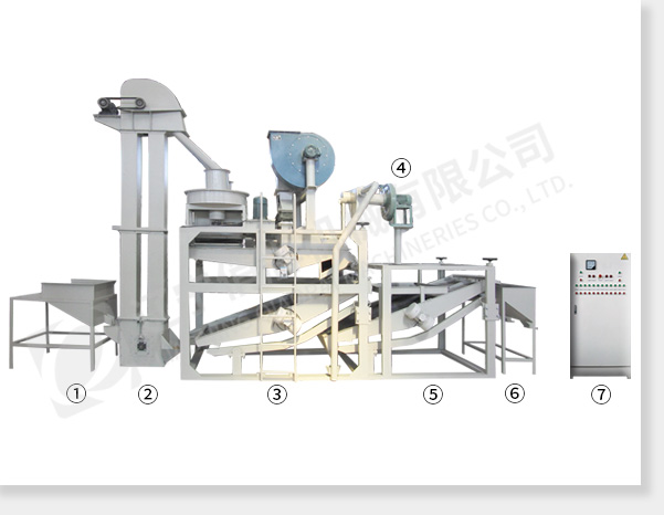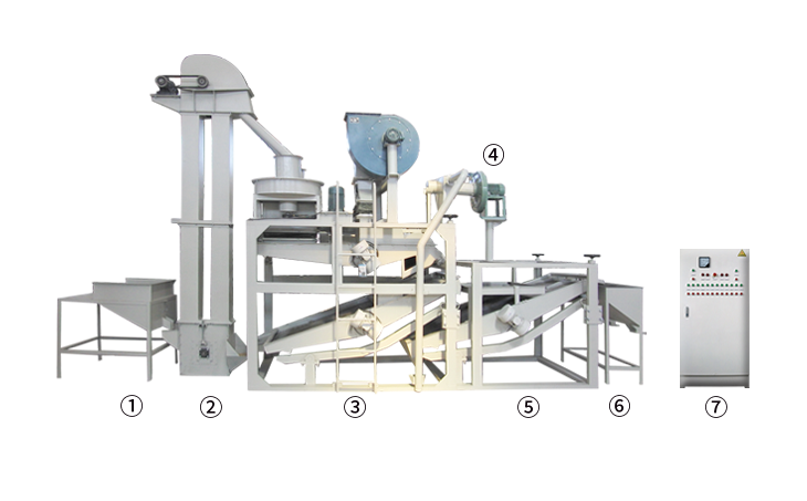 ① 上料斗②斗式提升機(jī) ③ 脫殼、風(fēng)選、分選主機(jī) ④ 風(fēng)力回料系統(tǒng) ⑤ 籽米復(fù)選機(jī) ⑥ 接料斗 ⑦ 電氣控制柜