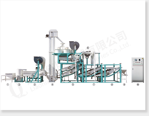 ① приёмный бункер ② спиральный элеватор для подъёма сырья ③ многофункциональная машина для удаления примесей ④ ковшовый элеватор ⑤ главная машина (шелушитель, вибросито для удаления шелухи и вибросито для сепарации нелущённой семечки и ядра) ⑥ пневматическое подъёмное устройство ⑦ машина для повторной сепарации нелущённой семечки и ядраⅠ ⑧машина для повторной сепарации нелущённой семечки и ядраⅡ ⑨ бункер для сбора ядра ⑩ электрический управляющий шкаф