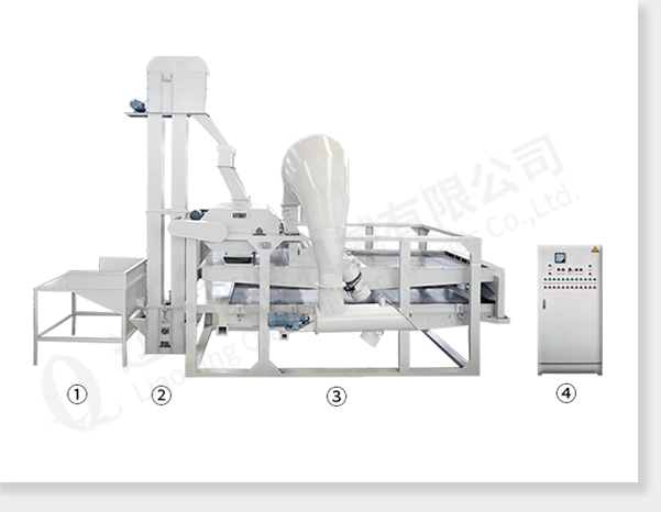 ① приёмный бункер ②ковшовый элеватор ③главная машина (шелушитель, вибросито для удаления шелухии вибросито для сепарации нелущённой семечки и ядра) ④электрический управляющий шкаф